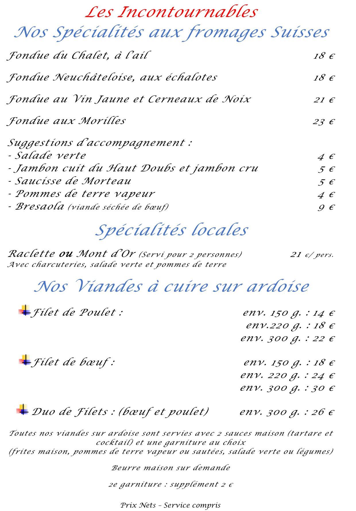 Le Chalet du Cervin vous propose des spécialités franco-suisses qui vous enchanteront ainsi que des viandes de qualité servies sur ardoise qui sauront vous surprendre en toute saison. Des portions généreuses nourriront tous les appétits, tandis que les gourmands apprécieront nos nombreux desserts. Les amateurs de vin seront comblés par notre carte des vins vaste et diversifiée. Vous pouvez aussi regarder certains de nos plats dans la galerie photos.